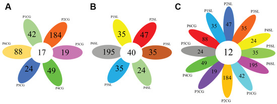 Venn diagrams comparing the number of population-specific and population-shared OTUs. (A) Comparison across different populations of Calotropis gigantea, (B) Comparison across different populations of Spinifex littoreus, (C) Comparison across all C. gigantea and S. littoreus populations. Abbreviations of sampled populations: P-Population (Population 1 to 6, P1 to P6), CG—C. gigantea, SL—S. littoreus.