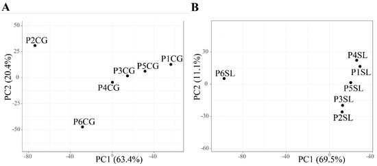 Principal component analysis of obtained bacterial OTUs present in the roots of (A) C. gigantea and (B) S. littoreus. Abbreviations of sampled populations: P—Population (Population 1 to 6, P1 to P6), CG—C. gigantea, SL—S. littoreus.