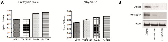 RT-qPCR was conducted to detect mRNA expression levels of ACE2 and TMPRSS2 in the whole rat thyroid. Both ACE2 and TMPRSS2 mRNAs were detected in all rat thyroid tissues. The transcript expression levels of ACE2 and TMPRSS2 compared with those of β-actin and GAPDH are shown in Figure 1A. In Western blot analysis (File S1), both ACE2 and TMPRSS2 proteins were expressed, but their expression was weaker than that in the reference kidney (Figure 1B). To confirm ACE2 and TMPRSS2 expression in follicular cells, the human follicular cell line Nthy-ori 3-1 was also evaluated. In PCR, ACE2 and TMPRSS2 mRNAs were expressed in Nthy-ori 3-1, but the Western blot revealed no protein expression of ACE2 and TMPRSS2 (Figure 1). The same results were obtained in all three experiments. These results suggest that ACE2 and TMPRSS2 proteins are expressed in tissue subsets other than follicular cells in the thyroid gland.