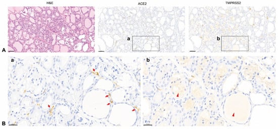 Immunolocalization of ACE2 and TMPRSS2 in the rat thyroid. (A) H&E staining (top left panel), ACE2 staining (top middle panel, brown), and TMPRSS2 staining (top right panel, brown). ACE2 and TMPRSS2 expression was observed sporadically in the whole thyroid tissue, but was not co-expressed. Scale bar = 50 μm. (B) At a higher magnification, ACE2 was not stained in follicular cells but in structures that appeared to be microvessels or lymphatics (arrow) between each follicle (a). TMPRSS2 was mainly expressed in the colloid (arrowhead) inside the follicle, but not in the follicular cells nor microvessles (b). Scale bar = 20 μm. H&E, hematoxylin and eosin; ACE2, angiotensin-converting enzyme 2; TMPRSS2, transmembrane protease serine.