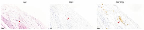 Expression of TMPRSS2 in the rat thyroid. Only TMPRSS2, not ACE2, was stained in relatively large vessels (arteriole/venule) (arrow) outside the rat thyroid gland. Scale bar = 20 μm. (H&E), hematoxylin and eosin; (ACE2), angiotensin-converting enzyme 2; (TMPRSS2), transmembrane protease serine.