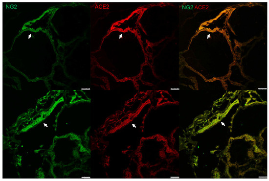 For immunofluorescence microscopy, frozen blocks were thawed in PBS to enhance penetration and were blocked with 1% BSA for 30 min to inactivate secondary antibody binding sites. The cryo-sections were incubated overnight in the anti-ACE2 (1 mg/mL) (Abcam) and anti-NG2 (nerve/glial antigen 2) (1 mg/mL) (Invitrogen, Waltham, MA, USA) at 4 °C. After three washes with PBS (3 min, each), the slides were incubated with the secondary antibodies for 30 min. The next day, slides were incubated with FITC- or TRITC-conjugated secondary antibodies for 30 min at 21 °C. Images were acquired by confocal microscope (LAS-X).