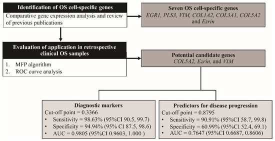 Overview of the study and workflow of methods. OS, osteosarcoma; COL1A2, collagen type-I alpha-2 chain; PLS3, plastin-3; COL5A2, collagen type-V alpha-2 chain; COL3A1, collagen type-III alpha-1 chain; EGR1, early growth response protein 1; VIM, vimentin; MFP; multivariable fractional polynomial, ROC; receiver operating characteristic curve; AUC, area under the ROC curve; CI, confidence interval.