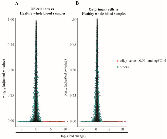 Comparative expression analysis. Volcano plots showing a pairwise comparison of gene expression in osteosarcoma (OS) cells (A) and OS primary cells (B) vs. healthy donors. The genes presented in red had an expression ratio of >2 (log2) and adjusted p-value < 0.01.