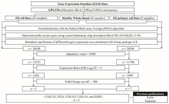 Liquid biopsy is an alternative technique for predicting metastasis, representing a promising approach for diagnostic, prognostic, and personalized therapeutic purposes. Among liquid biopsy biomarkers, circulating tumor cells (CTCs) represent a propitious avenue for identifying cancer metastasis. Owing to the novelty and complexity of the methods, these techniques are not widely used [8]. Cancer-specific mRNA analysis is one encouraging approach for tracing cancer cells in the blood; however, specific mRNA markers for OS are not generally established [9,10]. Comparative expression analysis using information from biodata resources is a new pregenital approach for the identification of tumor-specific markers. Among the sources of bioinformatics data, the Gene Expression Omnibus (GEO) has been widely adopted for identifying tumor-specific genes [11,12].