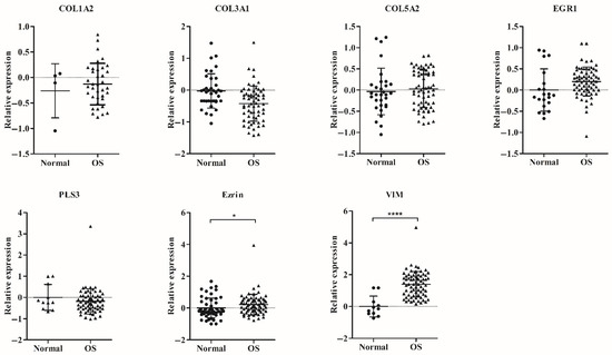 According to the involvement of VIM and ezrin in EMT and metastasis, we evaluated their expression together with newly identified OS-specific genes. The samples from OS patients (n = 73) and healthy donors (n = 79) (clinical characteristics shown in Table 2) were evaluated for expression of the candidate genes using qRT-PCR; the Ct values of each of the candidate genes were normalized with that of the global mean. The analysis demonstrated that the relative expression levels of ezrin and VIM (p < 0.05) were significantly higher in OS patients than in healthy donors (Figure 4).