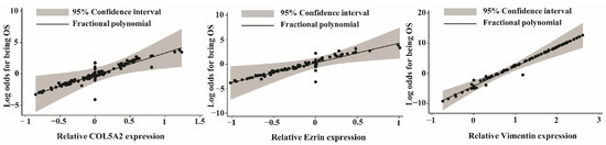 The association between the relative expression of each candidate gene and the log odds of OS was non-linear (Figure 5). In the diagnostic model generated using the MFP algorithm, COL5A2, ezrin, and VIM, which showed significant contributions to the model, were included, while COL1A2, COL3A1, EGR1, and PLS3 were excluded, as their p-values were less than 0.05 (data not shown). According to the diagnostic model, the probability of OS was calculated as follows: