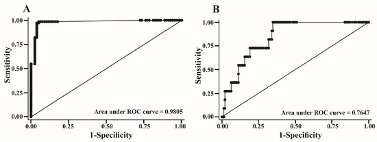 ROC curve analysis was performed on the expression of COL5A2, ezrin, and VIM in samples from OS patients and healthy donors to examine the diagnostic performance of the model for identifying OS (Figure 6A). At the probability cut off of 0.3366, the sensitivity was 98.63% (95% CI 90.5, 99.7) and the specificity was 94.94% (95% CI 87.9, 99.6), with an area under the ROC curve of 0.9805 (95% CI: 0.87.5, 98.6) (Table 4). Based on the derived MFP model, we further evaluated the ability of COL5A2, ezrin, and VIM to predict metastatic OS. Almost-stage-III OS samples were positive at the cut-off point of 0.8795 with 90.91% sensitivity (95% CI 58.7, 99.8), 60.99% specificity (95% CI 52.4, 69.1), and a 0.7647 area under the ROC curve (95% CI 0.6687, 0.8606) (Figure 6B).