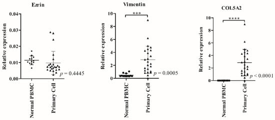 Due to the limitation of the samples, it was not possible to isolate circulating OS cells from the frozen buffy coat. To prove whether the measured candidate genes originated from OS cells in the bloodstream, the expression levels of COL5A2, ezrin, and VIM were analyzed in primary OS cells with qRT-PCR, and PBMCs from healthy donors were used as the control cells. Among the three candidate genes, the expression levels of COL5A2, PLS3, and VIM—all except ezrin—in OS cells were significantly higher than those of PBMC (p < 0.05) (Figure 7). COL5A2 is classified as a clinical biomarker for metastasis, such as gastric, colorectal, and bladder cancer, including osteosarcoma, and has been associated with the development of tumors in the immune system, proliferation, and angiogenesis [22,33,42,43,44]. In our study, a significantly higher expression level of COL5A2 was found in OS patients when compared to healthy donors. Thus, COL5A2 could be a novel liquid biopsy marker for prognosis prediction in OS. On the other hand, ezrin, which has been reported as a typical EMT marker, showed a significantly high expression in the frozen OS buffy coats, but not in primary OS cells. Since there was no difference in ezrin expression between OS primary cells and PBMCs, we supposed that the population of clusters of tumor cells with the potential to become CTCs was low in the primary OS tumors examined in this study. However, the expression status of ezrin, the EMT marker, in primary cells might not necessarily be an indication of CTC clusters inside primary tumors, especially before EMT changes begin. A previous study indicated that high mRNA and protein levels of ezrin in clinical ovarian carcinoma (OC) specimens of malignant effusions were observed when compared to solid tumors, including primary tumors and solid metastases. Moreover, overexpression of ezrin was found in spheroid OC cells compared to their three-dimensional alginate scaffold [45]. A study by Kim et al. showed that almost 50 percent of OS tumor specimens did not express ezrin [46], while more than 70 percent of CTCs were positive among 38 OS patients through RNA-ISH [10]. However, a high expression of ezrin, both in RNA and protein levels, in OS patients, was positively correlated with the metastatic stage and OS recurrence [47,48]. Thus, our study showed that the expression of ezrin was significantly higher in all PBMC specimens compared to an OS cell line under suspended conditions, but not in adherent conditions, as shown in the Supplementary Material (Figure S1). Unfortunately, this experiment’s sample size was small, meaning we cannot conclude there is a definite relationship between the histologic subtype and ezrin expression.