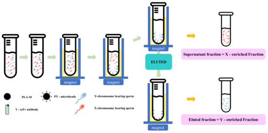 This novel method of sexing bovine sperm with MACS by using Y-scFv antibody can effectively separate X- and Y-sperm. This study showed the optimal level of Y-scFv coupling to the surface of PLA-M magnetic microbeads to be 2, 3, or 4 mg/mL, which demonstrated high-efficiency binding with Y-sperm and high accuracy of Y-sperm in the eluted fraction, with up to 78.01%, 78.63%, and 81.43%, respectively. Furthermore, this approach yielded a high proportion of X-sperm in the supernatant fraction, which represented the X-enriched fraction, up to 82.65%. These results showed that PY-microbeads bound to Y-sperm, and left X-sperm in the supernatant fraction, making the supernatant fraction an enriched X-sperm fraction with a low concentration of Y-sperm. Therefore, PY-microbeads bound to Y-sperm were trapped by the powerful neodymium magnet. Eluting buffer was used to separate the Y-sperm from the entrapped PY-microbeads. The Y-sperm were liberated from the PY-microbeads and remained in the eluted fraction. However, this fraction still had a low concentration of X-sperm because of the cross-reactivity of the Y-scFv antibody. The eluted fraction represented an enriched Y-sperm fraction. The success of this technology can be utilized to produce sex-selected sperm, allowing farmers to enhance the production of replacement female dairy cows.