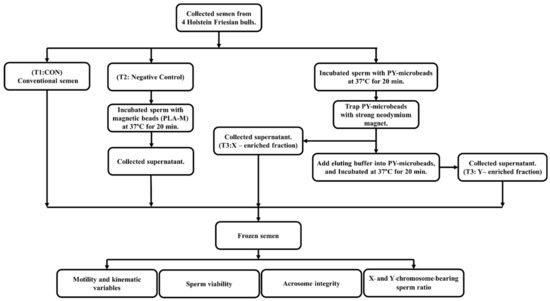 Fresh semen samples from four tropical Holstein Friesian bulls were collected five times per bull using an artificial vagina. The first treatment was conventional semen treatment (T1; CON), in which fresh semen was diluted to a final concentration of 8 × 107 cells/mL with a Tris–egg yolk-based extender (glycerol 8% v/v, egg yolk 20% w/v, D-Fructose 0.2% w/v, penicillin 1000 IU, and gentamycin 0.3 mg/mL). In the second treatment, fresh semen was incubated with PLA-M magnetic microbeads (unbound with scFv antibody) at 37 °C for 20 min and then diluted to a final concentration of 8 × 107 cells/mL in Tris–egg yolk-based extender (T2; negative control; NC). The third treatment (T3) was sexed by using PY-microbeads (ratio 2 mg/mL Y-scFv: 10 mg/mL PLA-M beads), as follows: Fresh semen was diluted to a final concentration of 1 × 109 cells/mL and incubated with PY-microbeads at 37 °C for 20 min. Then, the PY-microbeads, which captured Y-sperm, were trapped by a strong neodymium magnet. After that, unbound sperm were removed to new tubes (T3: X-enriched fraction). The sperm entrapped on the PY-microbeads were separated from the beads by incubation in the eluting buffer for 20 min at 37 °C. After that, the released sperm were transferred to new tubes (T3: Y-enriched fraction). Meanwhile, the X- and Y-enriched fractions were diluted to a final concentration of 8 × 107 cells/mL with a Tris–egg yolk-based extender. In all treatments the sperm samples were frozen. A diagram of the protocol for bovine semen sexing and evaluation in the present study is shown in Figure 2.