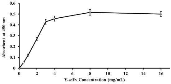 In this situation, the coupling capacity of the Y-scFv antibody to the magnetic microbeads was determined by using an anti-HA tag. The magnetic microbeads coupled with scFv antibody at each concentration were washed five times with 0.2 mL of DPBS. Then, 20 µL of goat polyclonal anti-HA tag peroxidase (1:100,000) was added and incubated at room temperature for 1 h. The sample was subsequently washed five times with 200 mL PBS. After that, 100 µL of TMB solution was added as the substrate and kept for 15 min at room temperature. Then, adding 2 M sulfuric acid, the reaction was stopped, and the absorbance at 450 nm was determined using a SpectraMax M3 microplate reader (Molecular Devices, San Jose, CA, USA). The immunoreactivities were compared using optical density (OD) measurements.