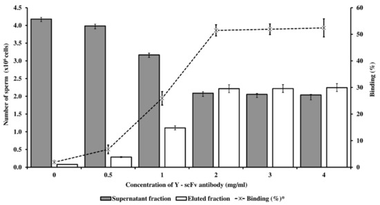 The coupling of Y-scFv antibody on the surface of magnetic microbeads was performed via EDC–NHS. The subsequent process consisted of the specific targeting and removal of Y-sperm by the Y-scFv antibody coupled to the magnetic microbeads. Selected concentrations of Y-scFv antibody were coupled to the surface of the magnetic microbeads, and as shown in Figure 4, increasing the concentration of Y-scFv antibody significantly increased the percentage of sperm binding, compared with that bound by uncoupled PLA-M microbeads (0 mg/mL Y–scFv). Furthermore, magnetic microbeads coupled with 2–4 mg/mL Y-scFv demonstrated a high sperm binding efficiency of up to 51.5–52.4% of total sperm samples with an X/Y-sperm ratio of 1:1 (Figure 4).
