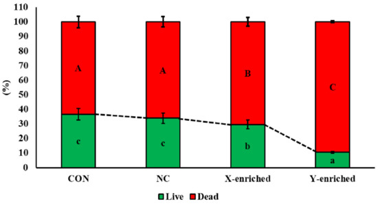 The percent viability of frozen–thawed sexed semen by PY-microbeads. Con: conventional frozen–thawed semen; NC: conventional semen incubated with nonactive PLA-M microbeads; X-enriched: sperm unbound by PY-microbeads; Y-enriched: sperm entrapped by PY-microbeads; A, B, C = comparison of dead sperm in each group; a, b, c = comparison of live sperm in each group.