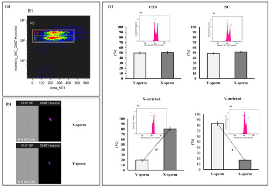 Discrimination between X- and Y-sperm after sexing by PY magnetic beads. (a) Regions are utilized to analyze sperm bearing the X and Y chromosomes. Separate populations of sperm bearing X and Y chromosomes were isolated, and the sex ratio in each sample was evaluated. (b) Patterns of sperm were observed with Hoechst 33,342. (c) Frequency histogram and percentage of sperm after staining with Hoechst 33,342. Con: conventional frozen–thawed semen; NC: conventional semen incubated with inactive magnetic PLA-M; X-enriched: fraction of sperm not bound by PY-magnetic beads; Y-enriched: fraction of sperm entrapped by PY-magnetic beads. * Paired t-tests were used to compare X- and Y-sperm from each group. p-value < 0.05 is statistically significant.