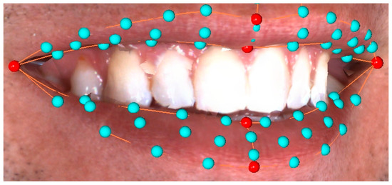 All three-dimensional images were imported into “ViewBox 4.1” software (dHAL Software, Kifissia, Greece) for further processing. This was done in two phases; first, the images were cropped to reduce artefacts and then digitized, using a pre-determined template. Digitization was performed by the same operator, according to a previously described protocol [33]. Smile shape was described with 62 landmarks. The centre of the upper and lower stomia, the right and left outer and inner stomia and the upper and lower midpoint of the outer lip curvature were regarded as fixed landmarks, while all other landmarks were handled as semi-landmarks and were allowed to slide along their respective curves or surfaces. In the first step of the digitization process, the outer and inner outlines of the mouth were delineated with curves that were placed manually along the anatomical boundaries of the upper and lower lips. In the second step, all 62 landmarks were automatically placed on these curves. The fixed landmarks were the ones placed at the extremes or at the midpoints of the curvatures, and the semi-landmarks were placed at equidistant positions along the upper and lower lip curvatures or on the surface of the upper and lower lip (Figure 1).