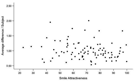 Scatterplot showing the association between smile consistency and self-perceived smile attractiveness. The y-axis represents the average landmark difference per individual between first and second smile and the x-axis represents the average score of each individual in self-perceived smile attractiveness.