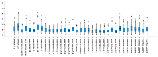Box plots showing the average and the range of differences (in mm) per upper lip point in milimeters.