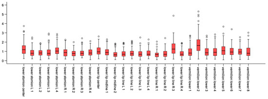 Box plots showing the average and the range of differences (in mm) per lower lip point in millimeters.