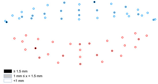 Following the sliding process, a pairwise partial Procrustes Superimposition was performed between corresponding sets of landmark configurations, in order to minimize the sum of squared distances between all individual landmarks [40]. Each set comprised the landmark configurations of the first and second study visits for each subject. The resulting shape coordinates were then extracted into an Excel worksheet (Microsoft Excel, Microsoft ©, Redmond, WA, USA) for further analysis. For each subject (i.e., for each set of smile configurations), the Euclidean distance between each of the 62 landmarks was calculated. In addition, the average distance of all landmarks for each subject and the average distance at each landmark were also generated.