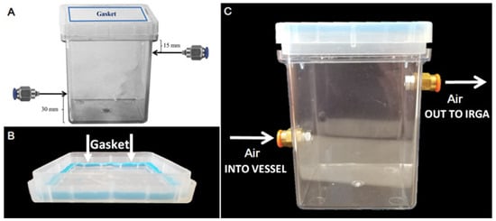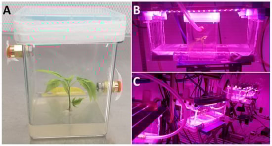 For these experiments, cultures of Cannabis sativa, accession RTG-XX were used (see Monthony et al. [26], for SNP-based genetic fingerprint). The plantlets were well established and had been maintained over long periods with regular subculturing occurring at 4–6 week intervals prior to this experiment. The cultures were stored at 27 ℃, under an 18 h photoperiod, 50 µmol m−2 s−1 PPFD (photosynthetic photon flux density), comprised of 75% R (600–700 nm), 12.5% B (400–500 nm), and 12.5% W (400–700 nm) for several weeks before experimentation. Multinodal explants with 5–7 nodes inclusive of apical meristems were excised from parental cultures and then subcultured to identical media containing 0.1% (v/v) antimicrobial plant preservation mixture, 0.532% (w/v) DKW, and 0.6% (w/v) agar, with pH adjusted to 5.7 before agar addition and sterilization. Medium components were obtained from PhytoTech Labs, Inc. (Lenexa, KS, USA). For experiment 1, explants were cultured with 3% (w/v) sucrose and no growth regulators. For experiment 2, explants were cultured without sucrose and with 2.5 µM IBA. Experimental cultures were maintained in customized Magenta vessels (GA-7, Magenta LLC, Lockport, IL, USA) (Figure 1 and Figure 2A). These customized Magenta vessels enabled gas exchange measurement during the experiments.