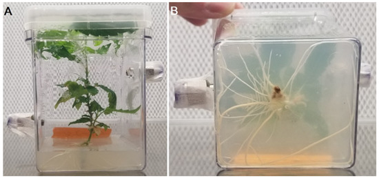 Experimental culture removed from acclimation for experiment 2. (A) Depicting above-ground biomass when removed from acclimation before the experiment (B) Showing root development of experimental specimen, depicting below-ground biomass.