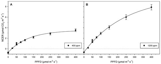 Light–photosynthetic response curves based on mean NCERs from experiment 1. Data represent average NCERs of 8 plantlets (n = 8). Error bars represent standard errors of mean. Depicted are (A) NCER values at 400 ppm [CO2] (B) NCER values at 1200 ppm normalized by leaf areas. Two mean values at 0 µmol m−2 s−1 PPFD are indicative of respiration prior to and following light exposure, respectively. Two means at 50 µmol m−2 s−1 PPFD show NCERs during initial exposure from darkness to 50 µmol m−2 s−1 PPFD and exposure to the same light intensity when sequentially reduced from 400 µmol m−2 s−1 PPFD back to darkness. Respiration rates were similar before and after the light exposures, whereas NCERs at 50 µmol m−2 s−1 PPFD were reduced by approximately 10–20% at the end of experimentation.