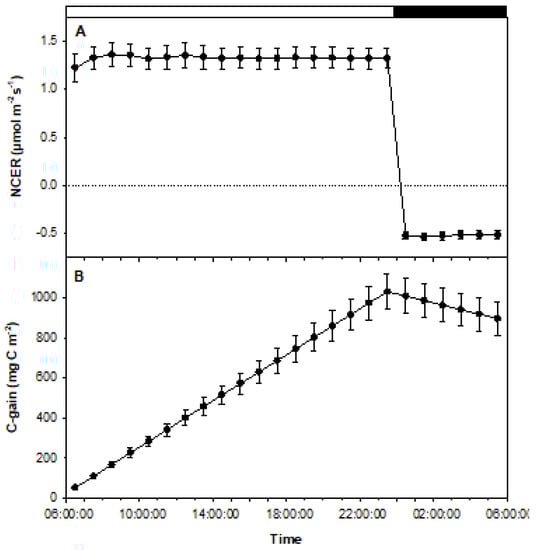 where C-gain is in mg C m−2; NCER Daytime is the positive NCER due to photosynthesis in the light and NCER Nighttime is the negative NCER due to respiration in the dark; and t1 and t2 are the time of the light and dark periods, respectively.