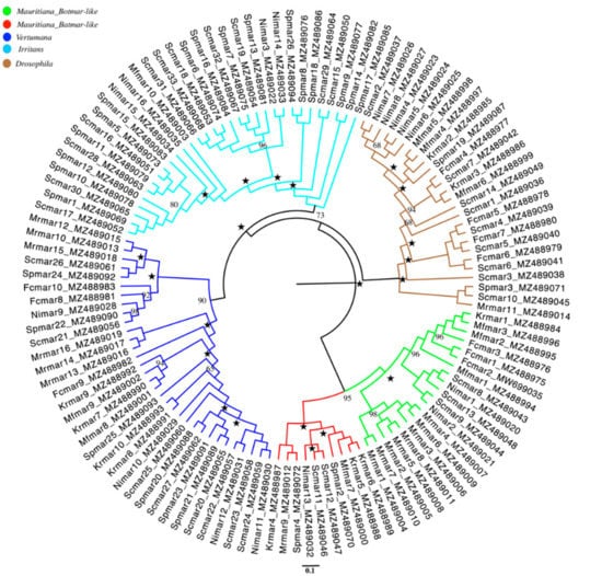 - Kharrat, I.; Mezghani, M.; Casse, N.; Denis, F.; Caruso, A.; Makni, H.; Capy, P.; Rouault, J.-D.; Chénais, B.; Makni, M. Characterization of mariner-like transposons of the mauritiana subfamily in seven tree aphid species. Genetica 2015, 143, 63–72. [Google Scholar] [CrossRef] [PubMed]