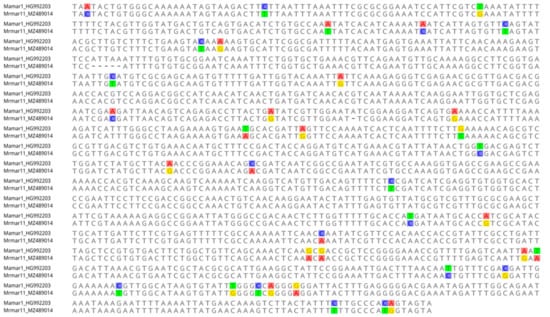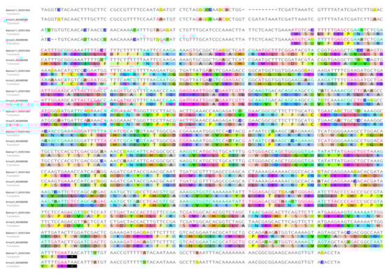 - Yamada, K.D.; Tomii, K.; Katoh, K. Application of the MAFFT sequence alignment program to large data—Reexamination of the usefulness of chained guide trees. Bioinformatics 2016, 32, 3246–3251. [Google Scholar] [CrossRef]