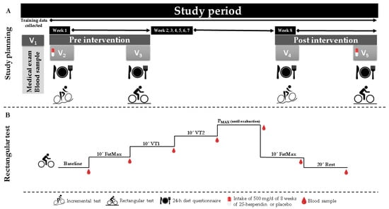 (A)-Study plan, 2S-Hesperidin intake was consume for eight weeks (visit two to visit five). (B)–Rectangular test, seven finger capillary blood samples were taken and analyzed on the ABL-90 FLEX blood gas meter.