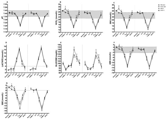 Differences between pre- and post-intervention intra-group differences in acid-base status parameters, lactate and glucose at different points of the rectangular test (A–G). * p < 0.05. # p = 0.05–0.08.