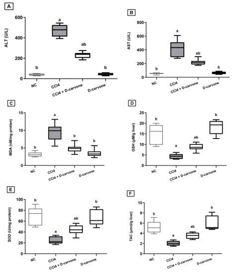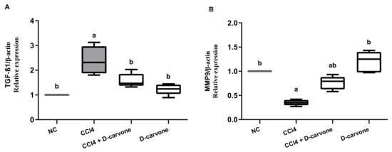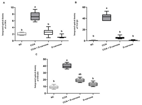 Chicago/Turabian StyleOgaly, Hanan A., Sharah A. A. Aldulmani, Fatimah A. M. Al-Zahrani, and Reham M. Abd-Elsalam. 2022. "D-Carvone Attenuates CCl4-Induced Liver Fibrosis in Rats by Inhibiting Oxidative Stress and TGF-ß 1/SMAD3 Signaling Pathway" Biology 11, no. 5: 739. https://doi.org/10.3390/biology11050739
