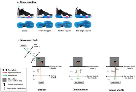 (a) Experimental shoe conditions and (b) movement courses for side-cut, complete turn and lateral shuffle.