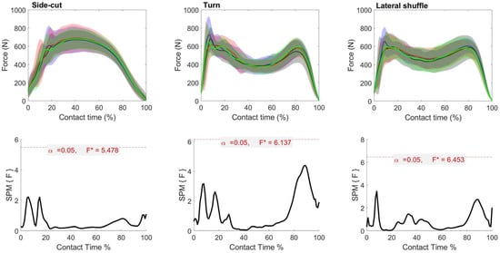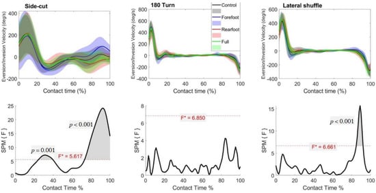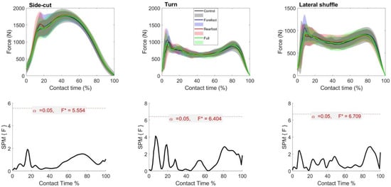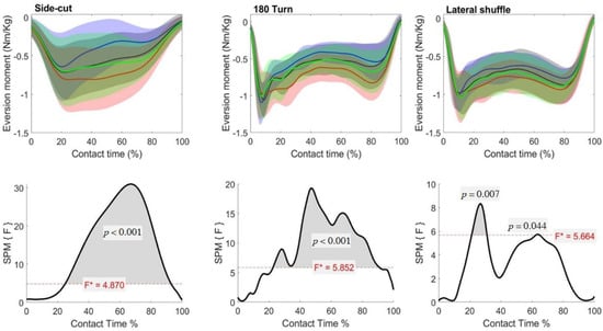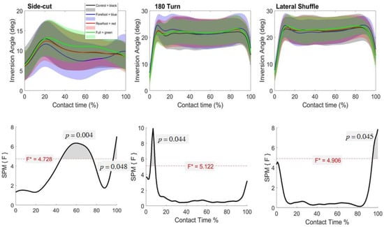 The group mean and standard deviation were calculated from the three trials for statistical analyses. For all kinematic and kinetic parameters in each participant and shoe condition, the mean time-normalized curves were computed to 101 data points during the ground contact phase. Most cutting-related studies investigated discrete variables that were zero-dimensional (0D) [5,6,12,28,33,38], despite the biomechanical data collected being one-dimensional (1D). This results in bias in the 0D results because this data type should be modeled with different randomness [39]. We applied statistical parametric mapping (SPM) to remove the limitations associated with selection of discrete parameters for time-series data because we were not certain during which phases of the change of direction maneuvers the later upper support would be effective [40]. The SPM analysis was conducted in MatLab (R2020a, 9.8.0, The Mathworks Inc., Natick, MA, USA). The source code was downloaded from https://spm1d.org/Downloads.html (accessed on 2 April 2022) and the SPM repeated measures ANOVA test was applied to compare differences between the shoe conditions. Significance was determined by the SPM(F) value exceeding the critical threshold, which is calculated by random field theory on equivalent random smooth data [40]. Significant ANOVA results were followed-up with post-hoc SPM paired t-tests between all shoe conditions. The alpha level for all tests was 0.05, and no adjustments were made for the multiple comparisons because this study was exploratory in nature. The null hypothesis was that there would be no differences in the kinetic and kinematic parameters tested during the change of the direction step.