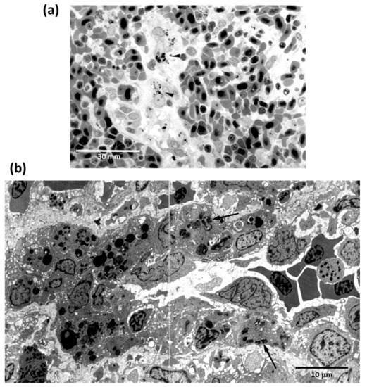 Light microscopy of the carbon uptake (arrowheads) by macrophages surrounding the splenic ellipsoids of Carassius auratus (a). By electron microscopy, ellipsoid macrophages (arrows) appear full off engulfed bacteria after intraperitoneal injection of Yersinia ruckeri (b).