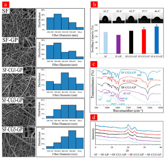(a) SEM images and the fiber diameter distribution of all electrospun mats. (b) Wettability of different electrospun mats in terms of swelling capacity and contact angle. (* shows significant differences between each group and SF at p < 0.05). (c) FTIR spectra of all nanofibrous scaffolds. (d) XRD patterns of different samples.