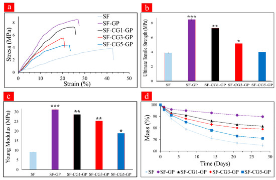 (a) Stress–strain curves, (b) UTS, and (c) Young’s modulus of nanofibrous mats. (***, ** and * show significant differences between each group and SF at p < 0.001, p < 0.01 and p < 0.05 respectively). (d) Degradation behavior of nanofibrous mats in protease XIV solution.