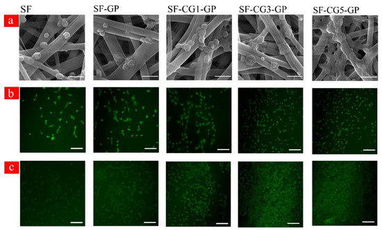 A similar trend was also obtained for Young’s modulus, as shown in Figure 2c (SF, 9.17 ± 0.3 MPa; SF-GP, 31.2 ± 1.2 Mpa; SF-CG1-GP, 28.7 ± 0.9 Mpa; SF-CG3-GP, 25.4 ± 0.3 Mpa; and SF-CG5-GP, 18.9 ± 0.5 Mpa). These findings suggest that the SF-based electrospun samples enjoy similar mechanical properties to non-weight-bearing bones, and they could be viable candidates for bone tissue applications [13].