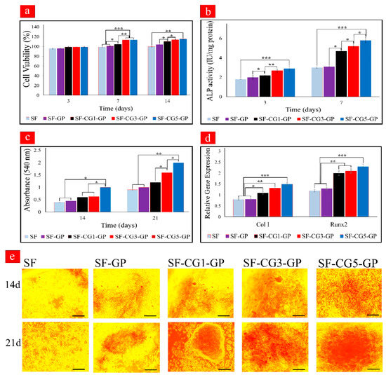 ALP is a biomarker of osteogenesis that appears in the early stage of osteogenic differentiation and is linked to osteoblast cell mineralization activity [50,51]. Calcification occurs through the hydrolysis of phosphate esters by ALP, which leads to the accumulation of inorganic phosphates and Ca2+ and thereby increasing ECM mineralization. The ALP enzyme is a transcription factor that activates the cell differentiation factors, as well as playing a role in message transmission and osteoblast differentiation [52]. ALP activity of MC3T3-E1 cultured in nanofibrous scaffolds was assessed by using an ALP kit, and the results are shown in Figure 4b. According to Figure 4b, the ALP levels of mats containing k-CG were significantly higher than that of pure SF, with the rate increasing over time. The highest amount of ALP expression was observed on SF-CG5-GP on Day 7. This could be attributed to the presence of sulfonate groups in k-CG. A similar trend was observed by Felgueiras et al., who found that grafting of sulfonate groups on Ti alloys could improve osteoblast differentiation [53].