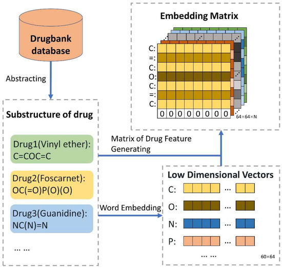 where means the j-th row of the weight matrix . In this paper, SMILES was seen as the drug structure corpus to make use of the word embedding method. The Python package of gensim was used to obtain the drug feature matrix. Then, in addition to the parameters of “size” being set to 64 and “min_count” being set to 1, the parameter values were default. So, as shown in Figure 2, each symbol is shown as a 64-dimension vector, thereby obtaining the drug feature matrix.