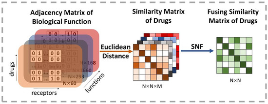 where and are, respectively, the element representation of the vectors and , and means the number of dimensions. Therefore, the weak similarity matrices among these initial vectors are calculated in each function space type. Then, it is particularly important to integrate M weak similarity matrices into a strong similarity matrix. Similarity Network Fusion (SNF), proposed by Wang et al. [41], is a competent approach to fusing massive biological context similarities [18]. SNF is a non-linear similarity fusion method, combining multi-similarity matrices into a single integrated similarity matrix, which carries all appropriate representation information. Eventually, SNF is applied to fuse M similarity N × N matrix into one N × N matrix, where N is the number of drugs. Figure 4 reveals the details of this process.