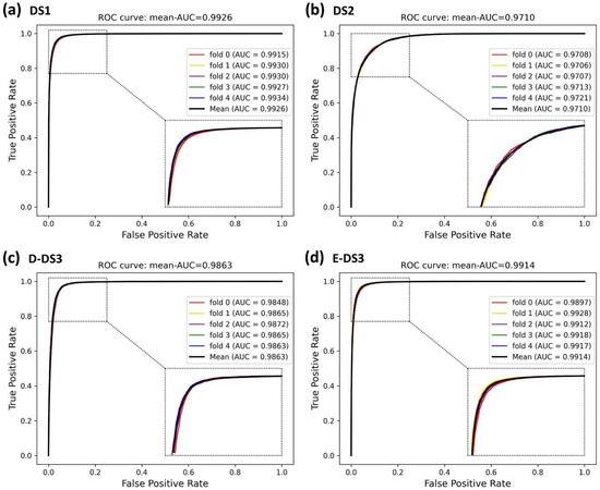 ROC curves of the five-fold cross-validation on the four datasets by the proposed method, BioChemDDI.
