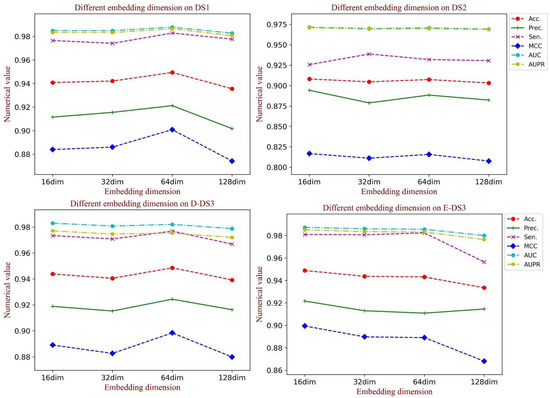 Embedding dimension has a crucial influence on the learning ability of graph structural information, in which a large value could cause inefficiency for training, while a small value could limit the learning ability. When generating the feature vectors of the network structure, we set the embedding dimension to 64 to obtain the rich topology information. To test the influence of the graph embedding dimension on the model performance, a comparative experiment was implemented. In this section, we analyzed the performance in different embedding dimensions containing 16, 32, 64 and 128. As Figure 8 shows, when the dimension is set to 64, there is a significant promotion of all the evaluation indicators on DS1 and D-DS3. Additionally, the competitive results were also obtained on the other datasets. Thus, we set the dimension of graph embedding as 64.