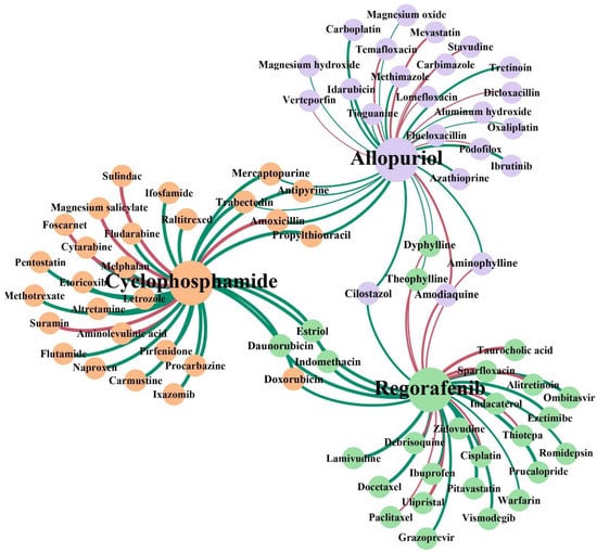 Network visualization of the newly discovered and known DDIs of the top 30 in each case study. The three colors of the node represent the three case studies. The red lines represent the interactions with no support and the green lines represent confirmed interactions. The thickness of the line between any two nodes represents the prediction score of the interaction.