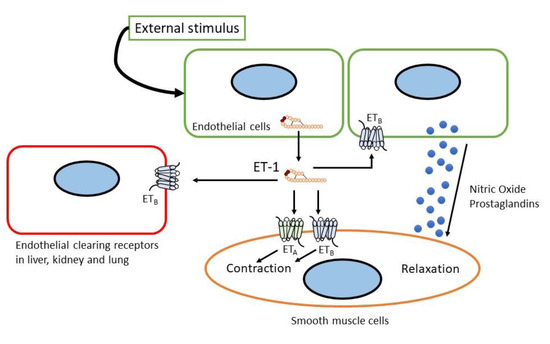 From the point of view of endothelin receptors, there seems to be some variability among the two endothelin receptors, ETA and ETB, in vascular tone control. Although the role of ETA in the vasculature appears to be clearer, the endothelial ET-1/smooth muscle ETA axis plays a straightforward balancing role in maintaining the vascular tone through the release of the aforementioned vasoconstrictors, and the role of ETB seems to be rather complex [131]. The ETB blockade caused an increase in blood pressure; however, ETB knockout mice did not develop elevated blood pressure [173,174]. Additionally, ETB together with ETA in the kidney has been reported to control the sodium retention function of the kidney and, in turn, cause changes in vascular tone [175]. Taken together, these results indicate that the endothelin system is essential for vascular tone control, and its dysfunction logically leads to pathological consequences.