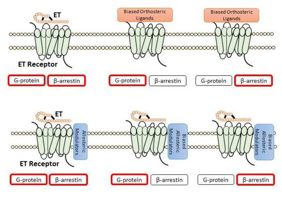 Recently, in the field of G-protein-coupled receptor (GPCR) research, targeting specific downstream pathways, such as G protein or β-arrestin, via biased orthosteric ligands and/or allosteric modulators, holds a novel paradigm for targeted drug development, as depicted in Figure 3 [260]. This concept has been explored in the cardiovascular field for angiotensin II type 1 receptor (AT1R). The downstream G-protein signaling of AT1R is considered cardio-deleterious, whereas β-arrestin has cardioprotective properties. Targeted novel agonists of AT1R β-arrestin, such as TRV027, have been investigated for heart failure treatment [261,262].