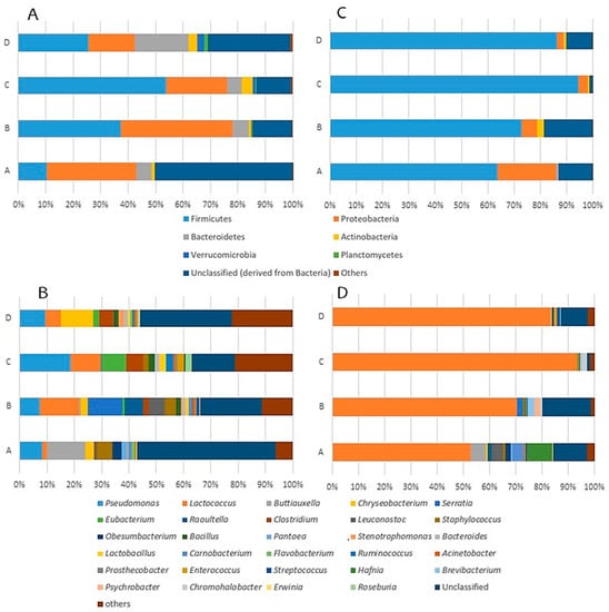 Relative abundance (%) of bacterial phyla and genera of Latxa ewe raw milk ((A,B), respectively) and 1-day-old ripened Idiazabal cheese samples ((C,D), respectively) produced by four producers (A, B, C, D).