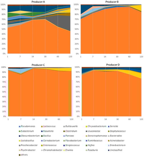 Microbial shifts at genus rank during ripening time (from 1 to 120 days) of Idiazabal cheese samples from different producers (A–D).
