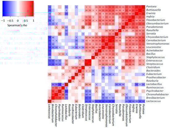 Spearman’s rank correlations between main bacterial genera found in Idiazabal cheese samples. Significant correlations are represented by ** p ≤ 0.01 and * p ≤ 0.05.